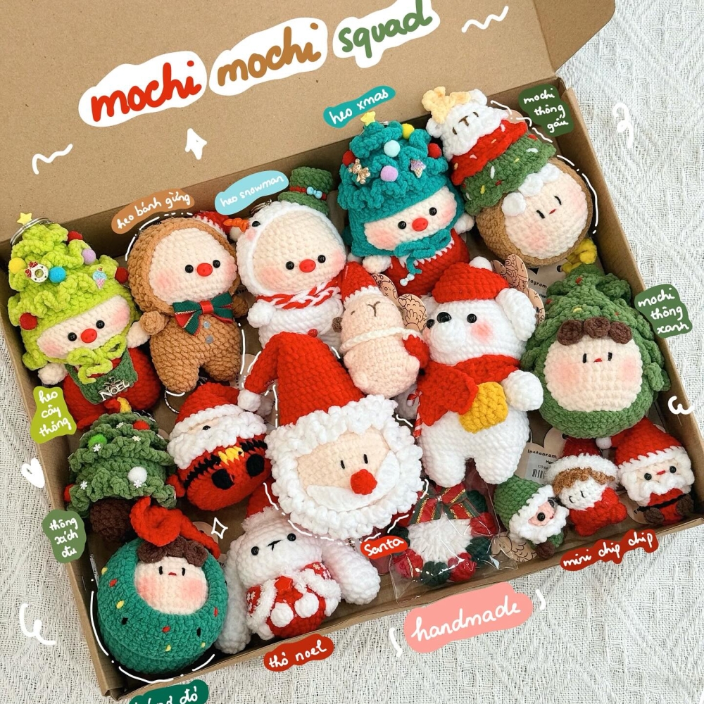 Bộ sưu tập Mochi & Loopy Noel handmade được lấy cảm hứng từ không khí Giáng Sinh ấm áp và những cảm xúc trong trẻo cuối năm. Những nhân vật quen thuộc được tái hiện với tạo hình mềm mại, gam màu ngọt ngào và những chi tiết Noel đáng yêu như mũ len, khăn choàng, cây thông nhỏ, kẹo, hưu... Mỗi sản phẩm đều được làm thủ công tỉ mỉ, mang theo dấu ấn riêng và sự chăm chút trong từng đường nét. Mochi & Loopy không chỉ là những món đồ trang trí nhỏ xinh, mà còn là điểm chạm dịu dàng mang đến cảm giác vui tươi, ấm áp cho mùa lễ hội. Bộ sưu tập như một lời chúc Giáng Sinh nhẹ nhàng, gửi đến những tâm hồn yêu sự dễ thương và bình yên.